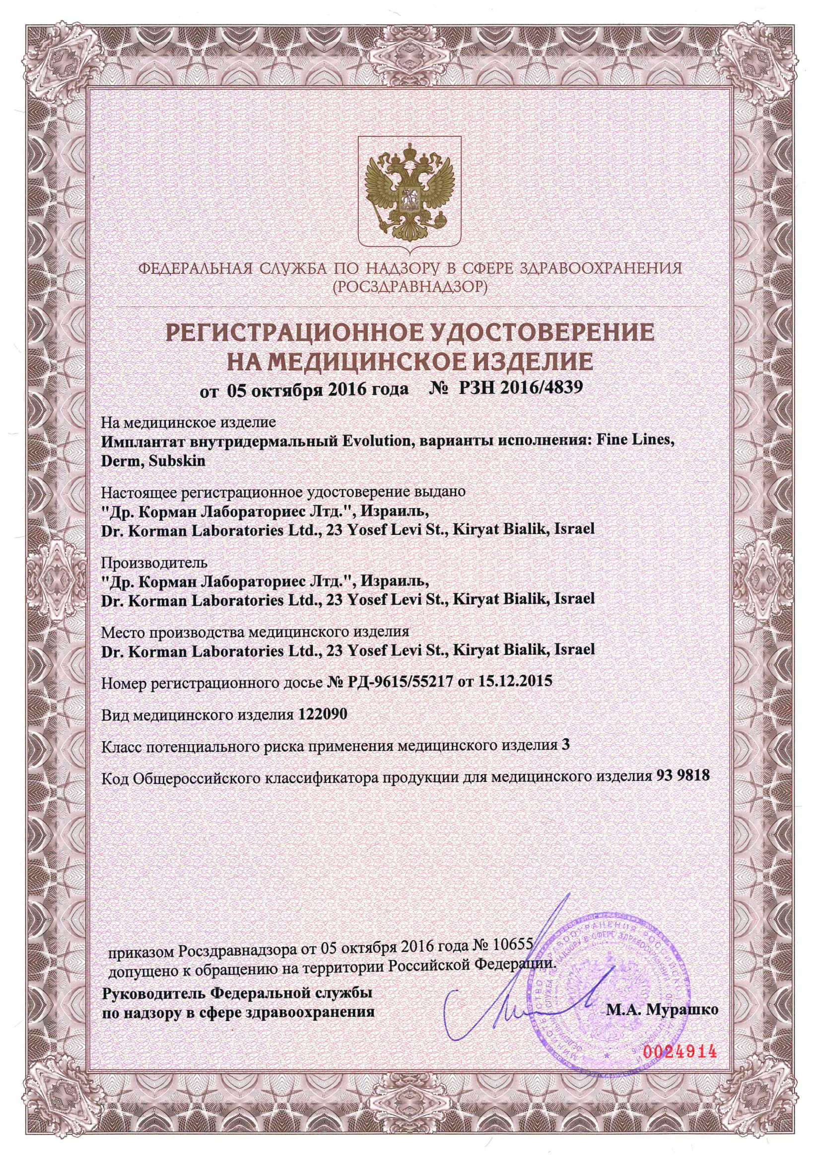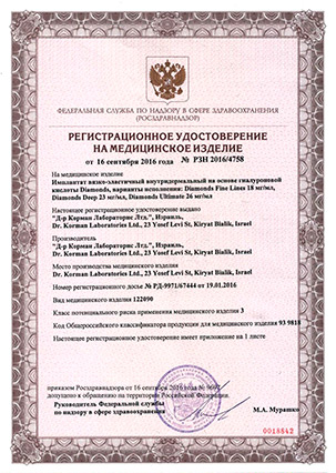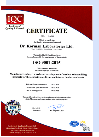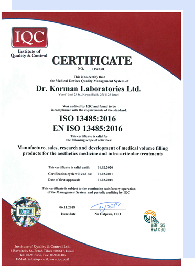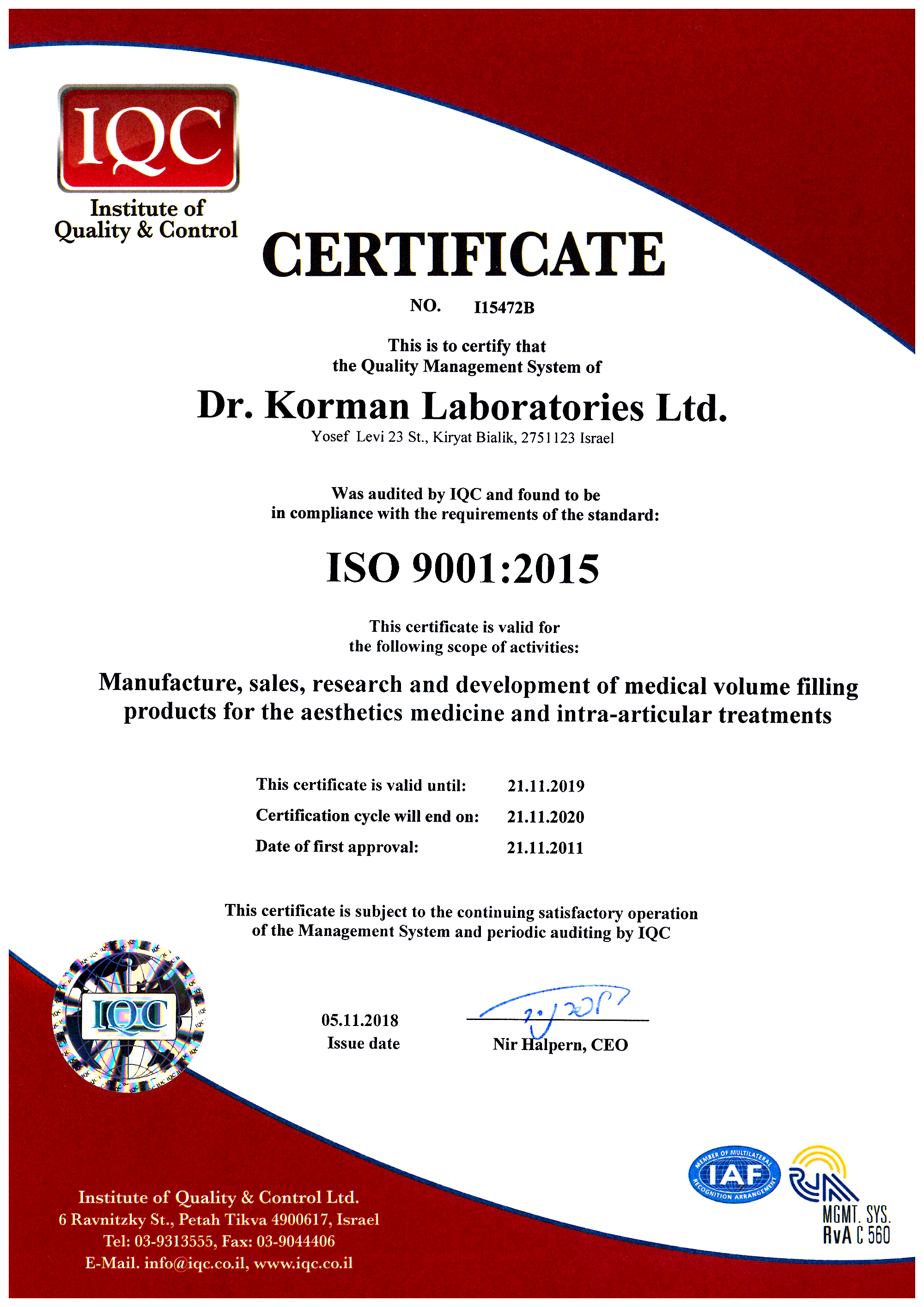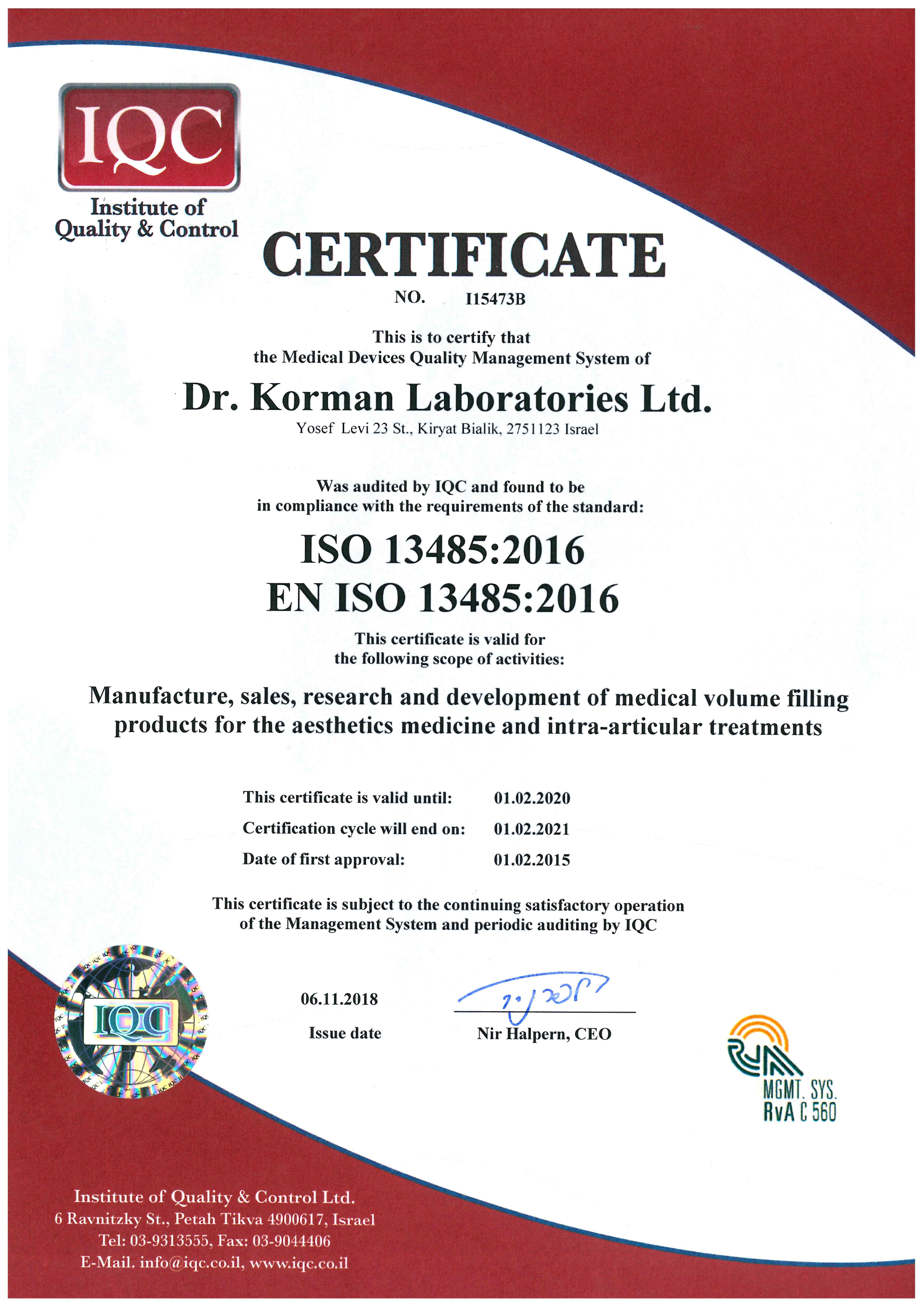 В 2013 году филлеры Dr.Korman Laboratories были сертифицированы в соответствие с директивой 93/42/ЕЕС, что гарантирует безопасность для здоровья человека.