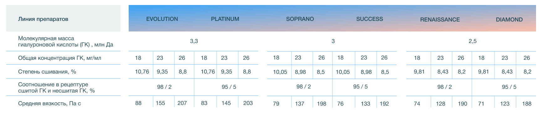 В препаратах разных линий используется гиалуроновая кислота с различной молекулярной массой, степенью сшивания и разным соотношением сшитой и несшитой фракций.