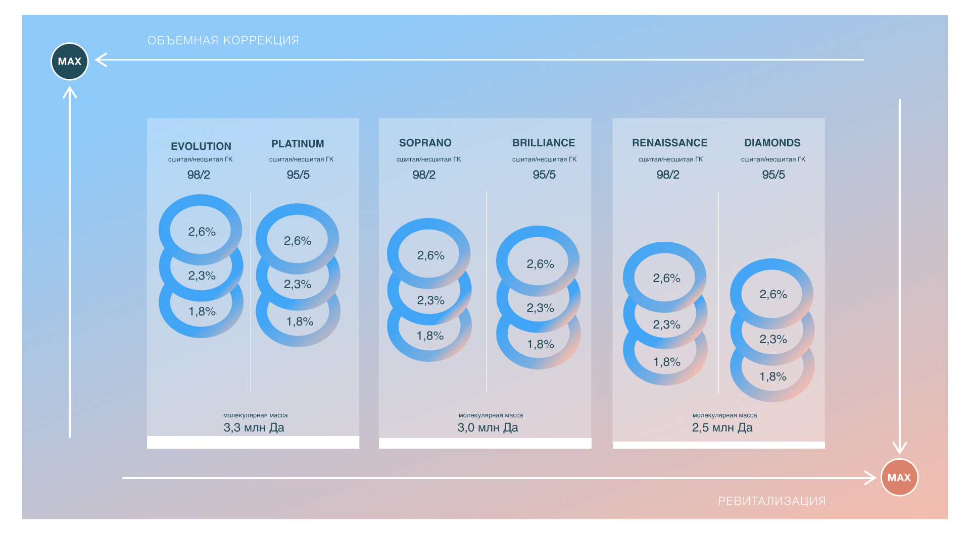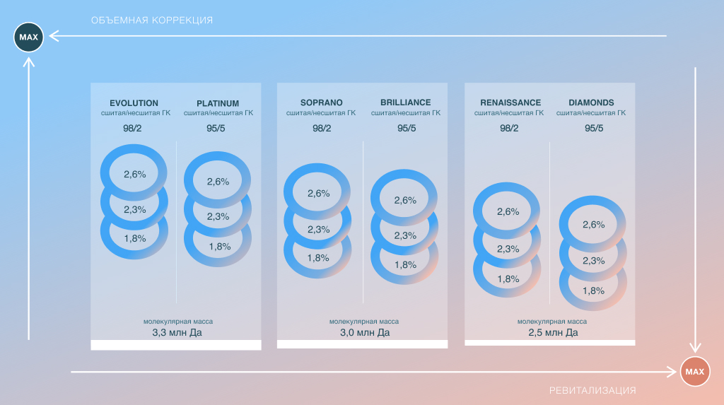 Высокая молекулярная масса гиалуроновой кислоты и большая длина цепи делают препараты устойчивее к активности собственной гиалуронидазы пациента и позволяют филлерам медленнее биодеградировать. При этом, несмотря на жесткость, препараты пластичны и хорошо распределяются.